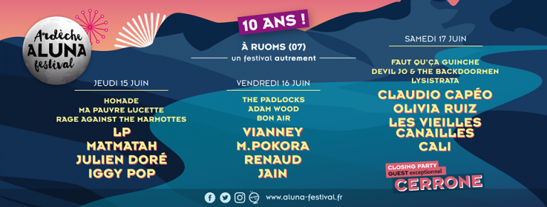 Le « festival autrement » fête donc ses 10 ans... autrement. Avec le goût du risque qui l'anime depuis sa création. L'Ardèche Aluna Festival s’encore remis en question cette année, ajustant son accueil et ses propositions artistiques, pour un public que l’on espère toujours plus nombreux, enthousiaste et fidèle.