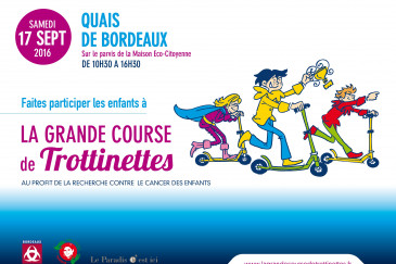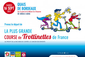 Bordeaux La Grande Course de Trottinettes de Bordeaux édition 2017 L’association Nire Laguna Thomas organise, avec le concours de l’agence événementielle Le Paradis C’est Ici, une course de trottinettes afin de récolter des fonds pour aider et médiatiser la recherche contre le cancer pédiatrique. publié le 28/08/2017 à 09:30