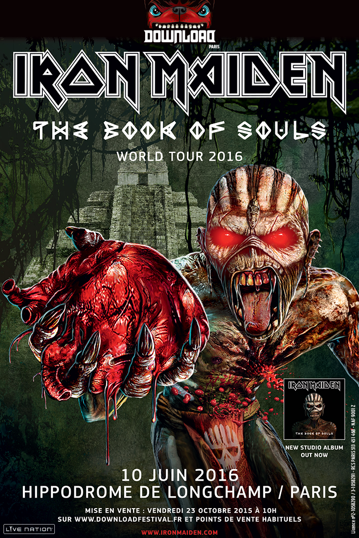 Iron Maiden est de retour. Les légendes du rock se rendront en France dans le cadre de leur tournée tant attendue, The Book of Souls Wolrd Tour. C'est le 10 juin 2016 au Download Festival à Paris que le groupe proposera son unique date en France. "Notre dernier concert commence à date et nous sommes impatients de repartir en tournée, indique Bruce Dickinson (...) Nous avons hâte de revenir à Paris, sur l'Hippodrome de Longchamp, dans le cadre du Download Festival en France".