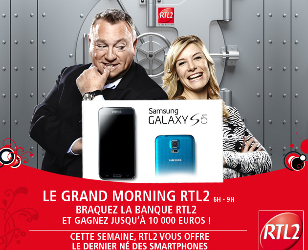 Écoutez le Grand Morning sur RTL2 de 6h à 9h. Et cette semaine RTL2 vous offre un Samsung Galaxy S5, ouvrez les coffres de la Banque RTL2 à 7h50 et 8h50 (0,34 euros/mn) et gagnez le dernier né des smartphones Samsung, le Galaxy S5. Avec RTL2 le son Pop-Rock.