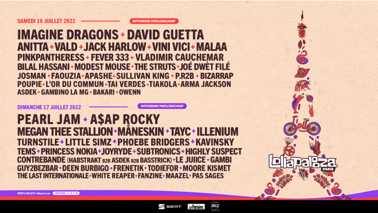 L'édition parisienne du du plus grand festival itinérant du monde vient d'annoncer la programmation complète de son édition 2022 et elle promet d'être monumentale. Måneskin, Tai Verdes et The Struts viennent rejoindre Imagine Dragons et Pearl Jam les deux têtes d'affiches annoncée en juillet derniers sur la scène de l'Hippodrome Paris Longchamp. Les deux géants historiques seront en tête d'affiche de Lollapalooza pour deux dates uniques en France en 2022. Imagine Dragons le samedi 16 juillet et Pearl Jam le dimanche 17 juillet.