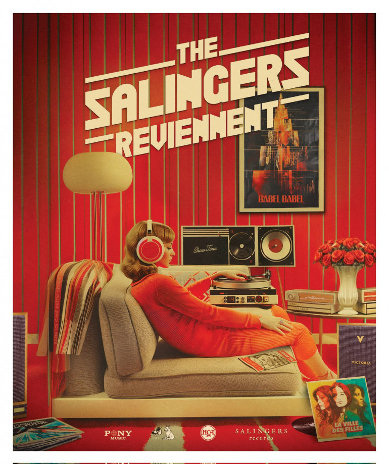 Cette affiche aux traits vintage montre une femme en train d'écouter un vinyle, sous le titre "The Salingers reviennent" dans la même typographie du groupe. Peut-être une référence au titre de 1990 Des fleurs pour Salinger ?