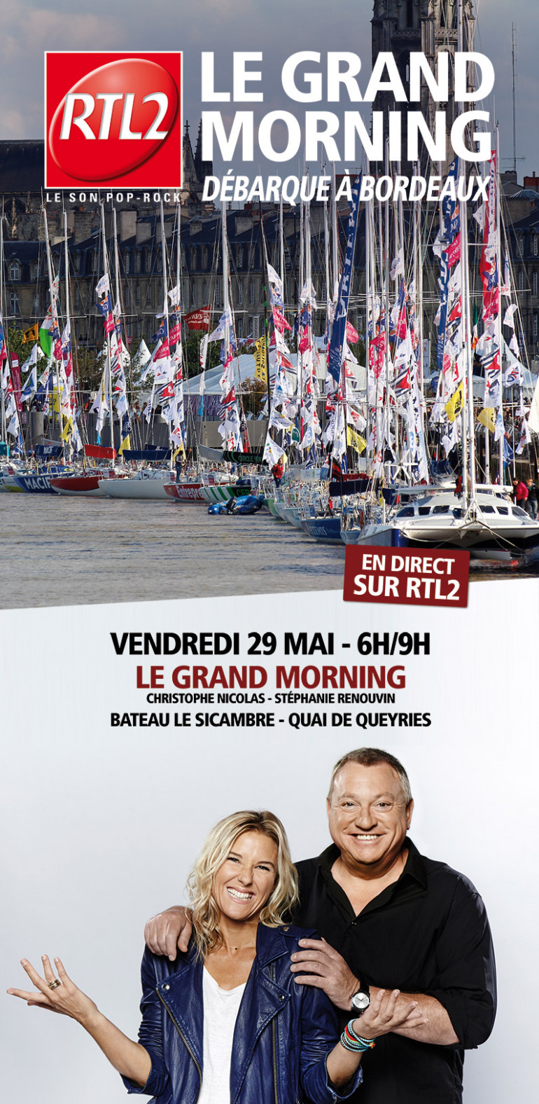 Christophe Nicolas et Stéphanie Renouvin vous réveilleront vendredi 29 mai dès 6h en direct du bateau "Le Sicambre" de la compagnie bordeaux River Cruise.
