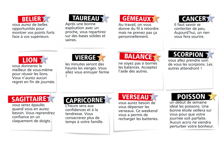 POISSON : un début de semaine idéal les poissons. Une bonne étoile veillera sur vous pour que votre journée soit parfaite. Aucun accro ne viendra perturber votre bonheur.