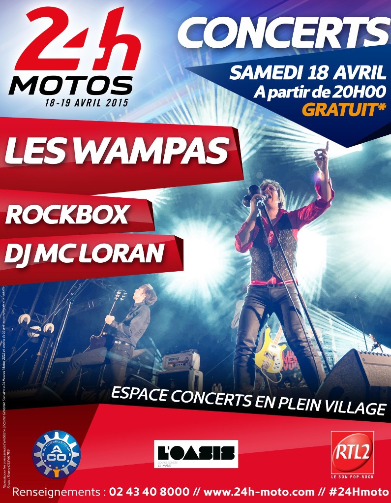 Deux groupes, Rockbox et Les Wampas et DJ MC Loran se produiront, à partir de 20 heures, sur la scène des 24 Heures Motos installée au cœur du village, en face du Restaurant de la Courbe, pour une soirée à ne pas manquer, organisée en partenariat avec RTL2, radio officielle des 24 Heures Motos.