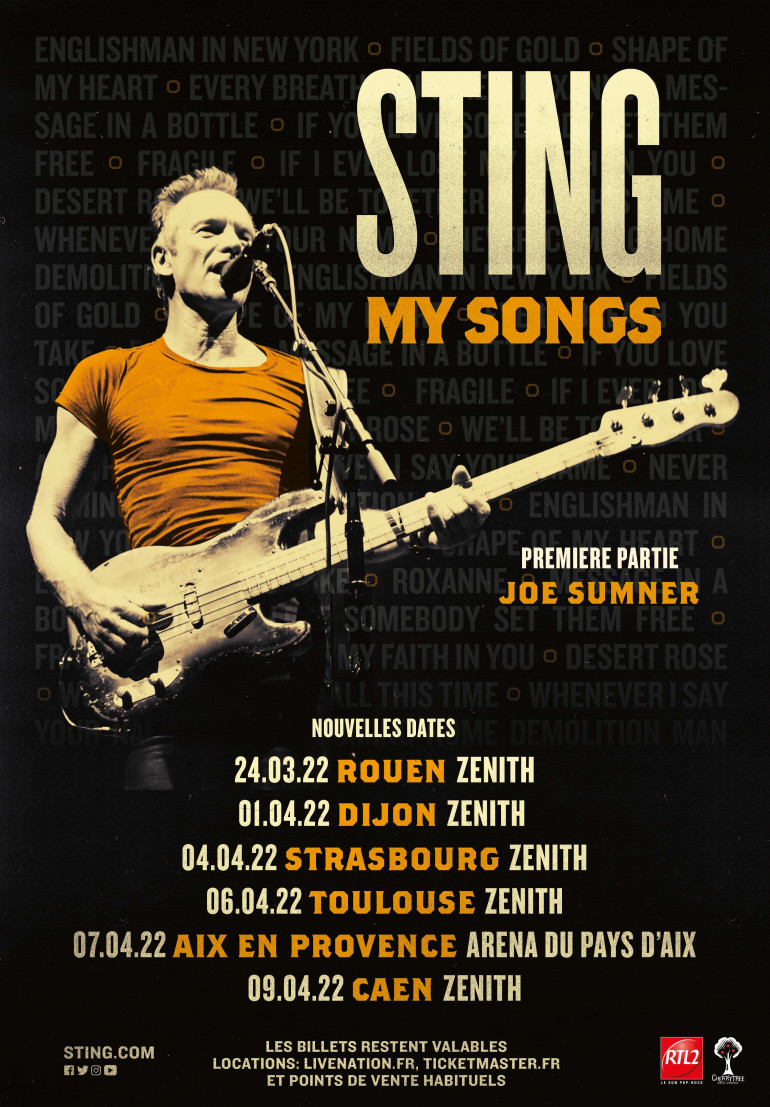 Le chanteur anglais a confirmé ce lundi 31 mai que sa tournée "Sting : My Songs" retournera bien en Europe en 20 22 pour des performances uniques dans cinq villes de France, dont deux nouveaux concerts à Rouen et à Caen, ainsi que des apparitions dans des festivals. Lundi 28 février The Cherrytree Music Company et Live Nation ont confirmé que Sting rajoutera une date au Zénith Saint-Etienne Métropole le 3 avril 2022.