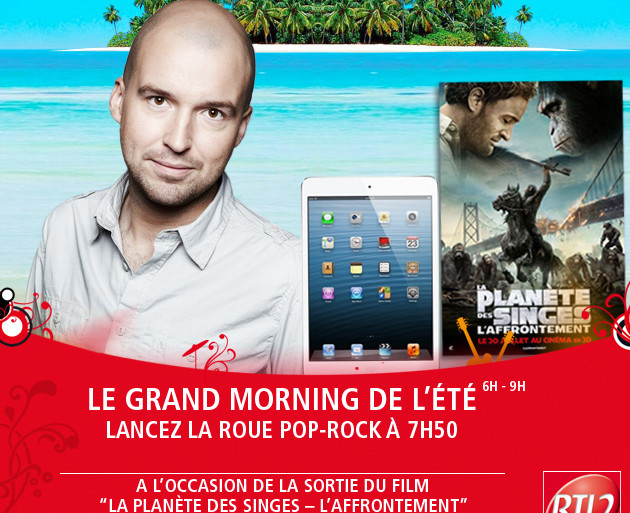 Écoutez le Grand Morning de l’été de 6h à 10h sur RTL2 avec Kévin Ollivier. A l’occasion de la sortie du film "La Planète des Singes – l’Affrontement", lancez la Roue Pop Rock à 7h50 et gagnez un iPad Air. "La Planète des singes : l’affrontement", mercredi 30 juillet au cinéma.
