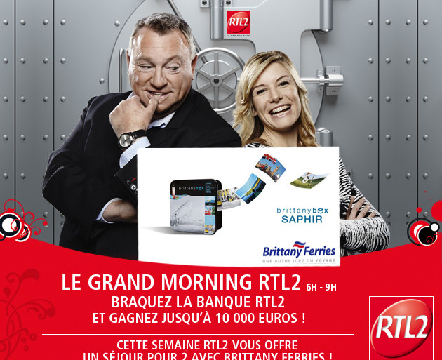 Écoutez le Grand Morning sur RTL2 de 6h à 9h. Et cette semaine, RTL2 vous offre un séjour pour 2 avec Brittany Ferries. Ouvrez les coffres de la Banque RTL2 à 7h50 et 8h50 (0,34 euros/mn), et offrez-vous une traversée maritime et l’hébergement grâce au Coffret Saphir de Brittany ferries. Écosse, Espagne ou Londres, c’est vous qui choisissez votre destination. Avec RTL2 le son Pop-Rock.