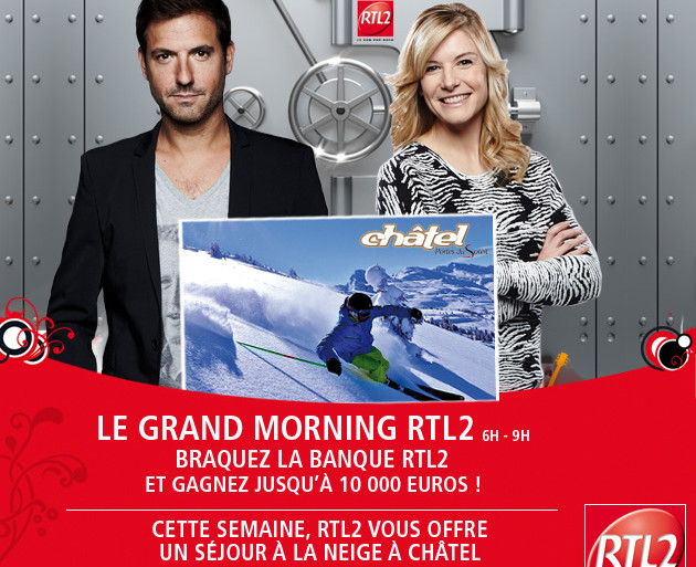Écoutez le Grand Morning sur RTL2 de 6h à 9h. A cette occasion, ouvrez les coffres de la Banque RTL2 à 7h50 et 8h50 au 32 28 (0,34 euros/mn) et gagnez un séjour à la neige pour 2 en hôtel 3 étoiles à Châtel, avec forfaits, location de matériel, et vos invitations pour le Grand Morning RTL2 spécial Châtel. RTL2 le son Pop-Rock.