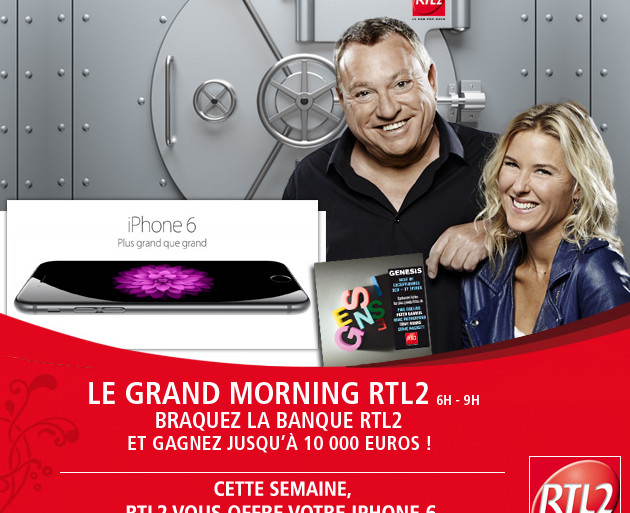 Écoutez le Grand Morning sur RTL2 de 6h à 9h. Et cette semaine à l’occasion de la sortie du coffret 3 CD « R-Kive » de Genesis, RTL2 vous offre le nouvel iPhone 6. Ouvrez les coffres de la Banque RTL2 à 7h50 et 8h50 au 32 28 (0,34 euros/mn), et gagnez votre iPhone 6 et le coffret « R-Kive » de Genesis : les meilleurs titres du groupe et de chaque membre en solo. Avec RTL2, le son Pop-Rock !