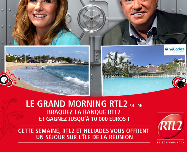 Écoutez le Grand Morning sur RTL2 de 6h à 9h. Et cette semaine, ouvrez les coffres de la Banque RTL2 à 7h50 et 8h50 (0.34 euros/mn) et partez pour un séjour sur l'île de la Réunion avec Héliades. Un séjour de rêve pour 2 dans l'hôtel 3 étoiles Club Héliades Domaine des Mascareignes, 29° à l'ombre, autant dans l'eau. Avec RTL2 le son Pop-Rock.