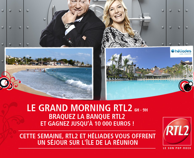 Écoutez le Grand Morning sur RTL2 de 6h à 9h. Et cette semaine, ouvrez les coffres de la Banque RTL2 à 7h50 et 8h50 (0.34 euros/mn) et partez pour un séjour sur l'île de la Réunion avec Héliades. Un séjour de rêve pour 2 dans l'hôtel 3 étoiles Club Héliades Domaine des Mascareignes, 29° à l'ombre, autant dans l'eau. Avec RTL2 le son Pop-Rock.