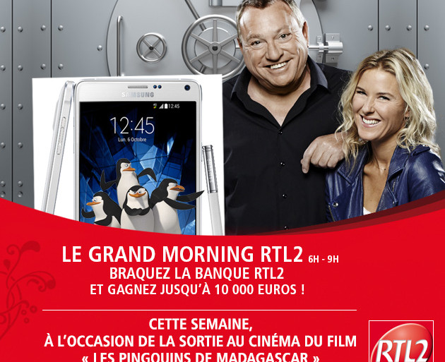 Écoutez le Grand Morning sur RTL2 de 6h à 9h. Et cette semaine à l’occasion de la sortie au cinéma du film « Les Pingouins de Madagascar » RTL2 vous offre la toute dernière tablette Samsung ! Ouvrez les coffres de la Banque RTL2 à 7h50 et 8h50 au 32 28 (0,34 euros/mn) et gagnez votre tablette Samsung Galaxy Note 4.