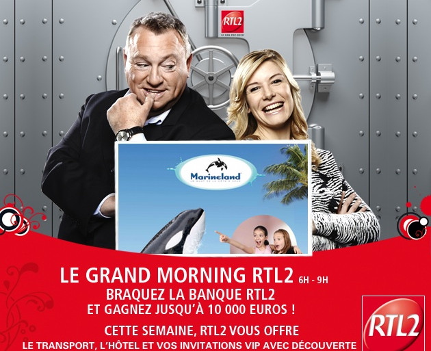 Écoutez le Grand Morning sur RTL2 de 6h à 9h. Et cette semaine, ouvrez les coffres de la Banque RTL2 à 7h50 et 8h50 (0,34 euros/mn), et gagnez le transport, l’hôtel et vos invitations VIP avec découverte des coulisses de Marineland, pour rejoindre toute l’équipe du Grand Morning RTL2.