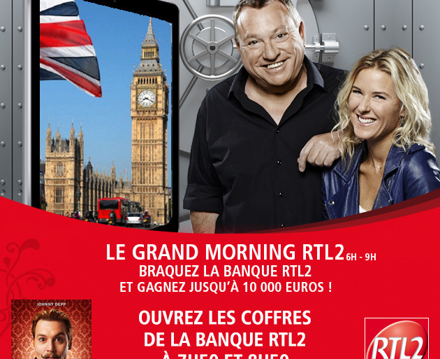 Écoutez le Grand Morning sur RTL2 de 6h à 9h. Cette semaine, à l’occasion de la sortie en salle du film « Charlie Mortdecai » RTL2 vous offre votre séjour à Londres, ouvrez les coffres de la Banque RTL2 à 7h50 et 8h50 et gagnez votre nouvel iPad ou partez à 2 en week-end à Londres.