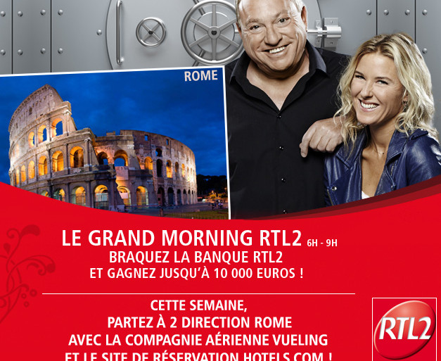 Écoutez le Grand Morning sur RTL2 de 6h à 9h. Et cette semaine, ouvrez les coffres de la Banque RTL2 à 7h50 et 8h50 au 32 28 (0,34 euros/mn) et partez à 2 direction Rome avec la compagnie aérienne Vueling. L’Italie vous attend avec Vueling et RTL2 le son Pop-Rock !