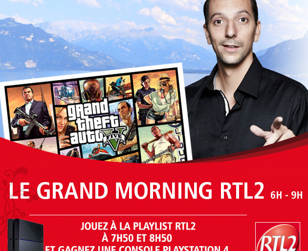Écoutez le Grand Morning sur RTL2 de 6h à 9h. RTL2 vous offre une console Playstation 4 et le jeu GTA 5. Jouez à la Playlist RTL2 à 7h50 et 8h50 au 32 28 (0,34 euros/mn) et gagnez une console Playstation 4 et le jeu GTA 5. Joyeux Noël avec RTL2 le son Pop Rock.