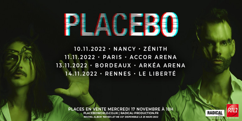 C'est chose faite ! Placebo annonce ce mardi 9 novembre une série de dates en France en partenariat avec RTL2. Les Britanniques passeront par le Zénith de Nancy le 10 novembre 2022, puis par Paris à l'Accor Arena le 11 novembre, Bordeaux à l'Arkéa Arena le 13 novembre, avant de finir le 14 novembre au Liberté à Rennes. Mise en vente des billets le 17 novembre.