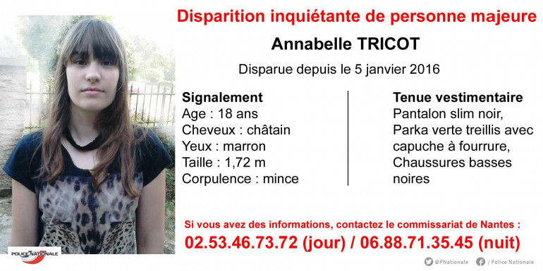 La jeune Annabelle TRICOT - 18 ans - a été retrouvée saine et sauve dans un hôtel du centre ville de Nantes vendredi 8 janvier dans la soirée. C'est grâce à l'appel à témoins relayé dans les médias que le gérant de l’hôtel a reconnu la jeune fille.
