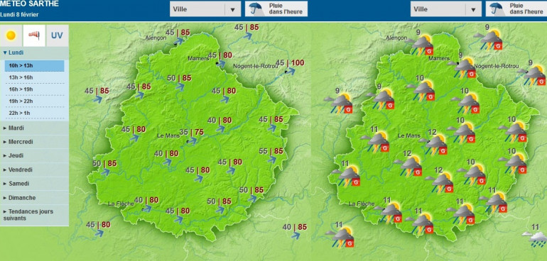 A noter que de fortes pluies sont également attendues toute la journée en Sarthe. Ce temps-là est de nouveau annoncé pour demain. Côté mercure, c'est la douceur qui domine avec entre 10° et 12° au plus chaud