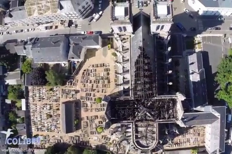 Le drone de la société de production Colibri Birdview Production a pu prendre des images aériennes des dégâts de la toiture de la basilique St-Donatien à Nantes après l'incendie du 15 juin.