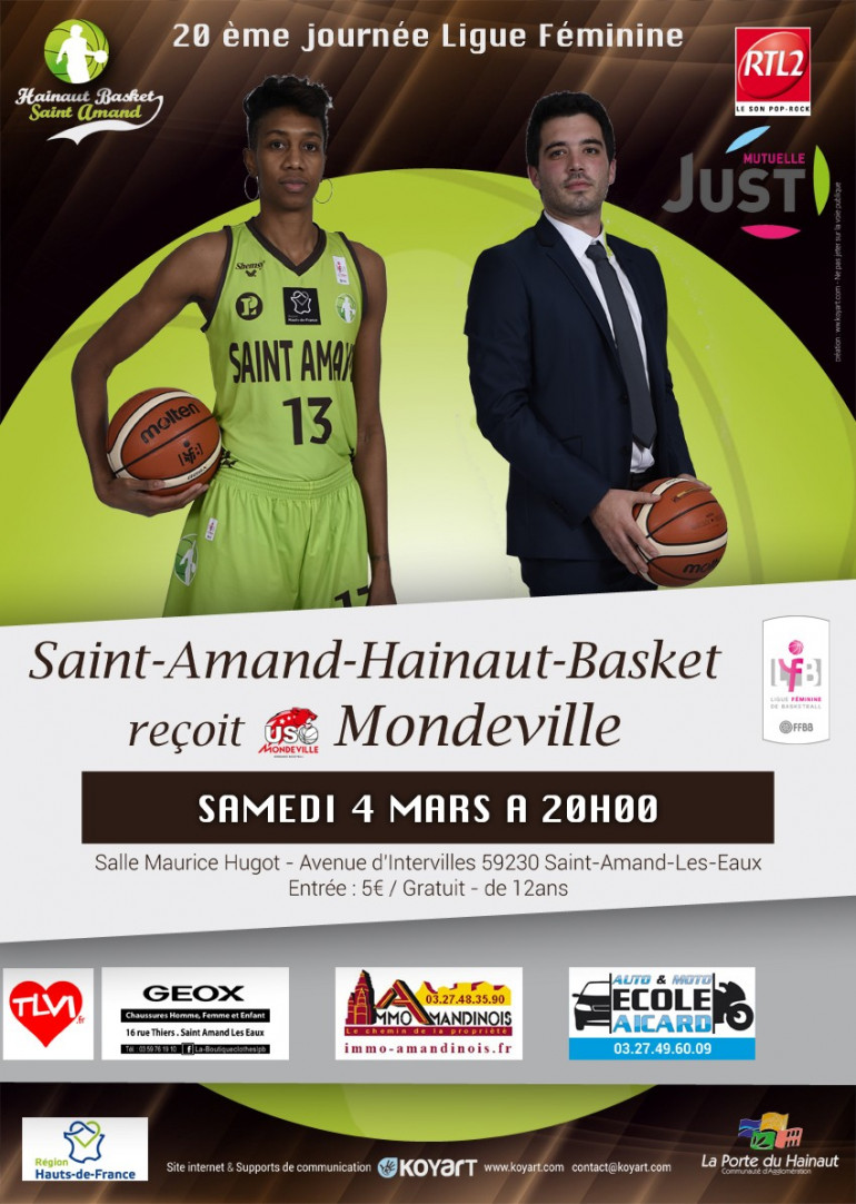 C'est la 20ème journée de ligue féminine le samedi 04 mars à 20h00. L'équipe de Saint-Amand-Hainaut Basket reçoit Mondeville.