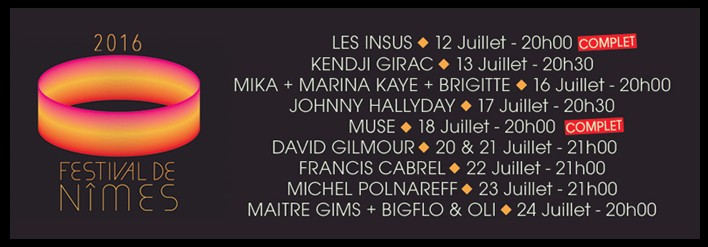 La nouvelle est tombé le groupe MUSE sera au festival de Nimes le lundi 18 juillet, 9 ans après leur dernière venu, avec leur tournée Drones World Tour, la location des places ouvre aujourd’hui à 10h00 dans les points de ventes habituels et sur http://www.festivaldenimes.com/ pour rappel à l’affiche de cette édition 2016 : il y aura aussi , LES INSUS …attention c’est déjà complet , Kendji, Mika, MARINA KAYE BRIGITTE JOHNNY HALLYDAY DAVID GILMOUR FRANCIS CABREL MICHEL POLNAREF et MAITRE GIMS …. Un évènement RTL2 réservation des places dans vos points de ventes habituels.
