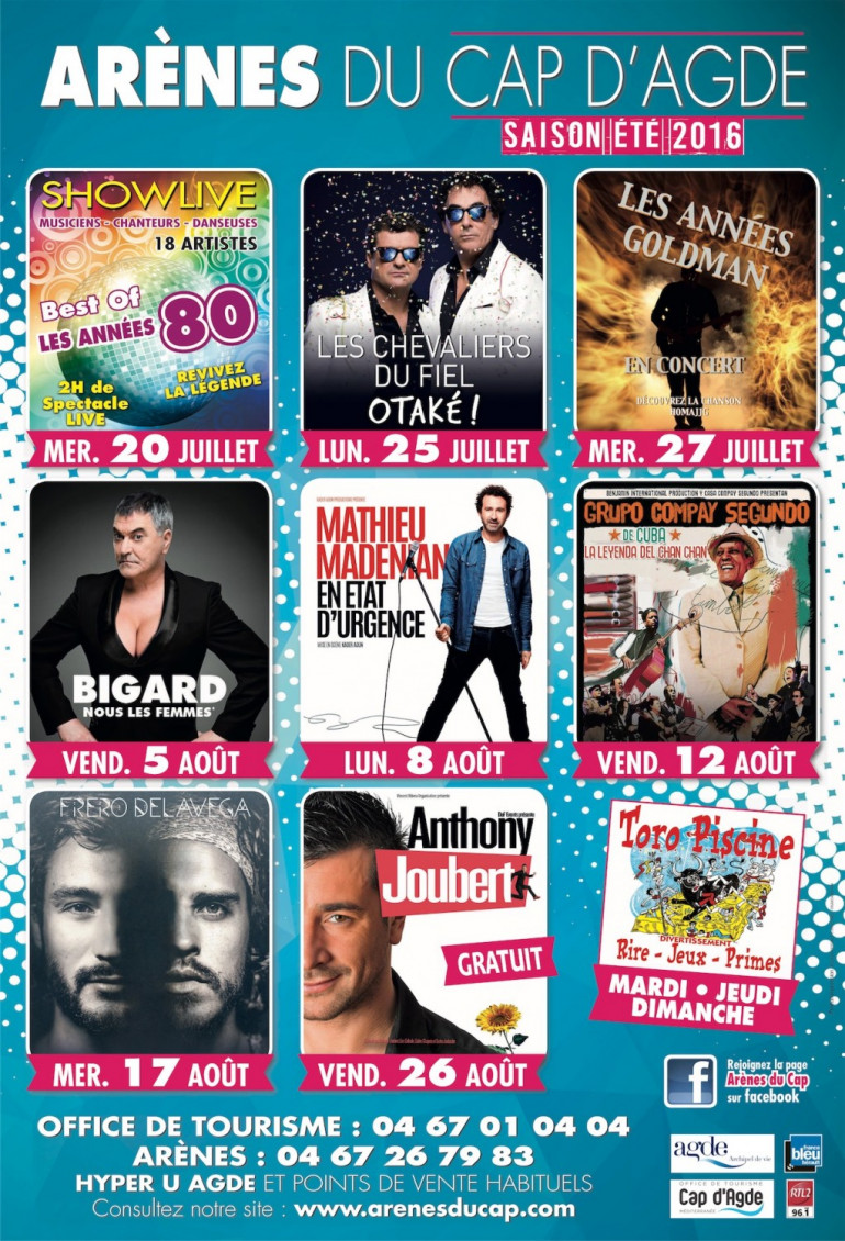 La programmation des arènes du cap d’Agde pour cet été,lundi 8 août Mathieu MADÉNIAN et son one man show EN ÉTAT D'URGENCE et Mercredi 17 août Les Fréro Delavega en concert