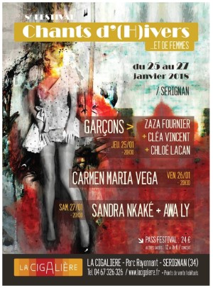 Un gros plans sur la 8° édition du Festival chants d’Hivers de Femmes du 25 au 27 janviers 2018 à la Cigalière de Sérignan, pour l’ouverture Zaza Fournier, Cléa Vincent et Chloé Lacan enfilent leurs costards cravates et se glissent dans le répertoire des années (50/70) pour s’approprier des chansons d’hommes, qui parlent des femmes, vendredi 26 janvier CARMEN MARIA VEGA, avec sa nouvelle tournée ULTRA VEGA et samedi 27 janvier Sandra Nkaké et Awa Ly, une soirée enchanteresse pour clôturer ce festival en apesanteur… www.lacigaliere.fr pour la réservation des places et toutes les infos !