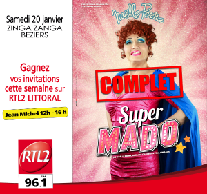 Samedi 20 janvier Noëlle Perna est de retour à Béziers à la salle Zinga Zanga avec son spectacle « Super Mado » « Elle a le caractère qu’il faut pour enlever le string et aborder le sexe, le sport, les goûts et les couleurs, l’actualité, la science, la politique, avec une subtile malice teintée de sagesse populaire faussement savante et ingénue. » Attention le spectacle est complet et vous gagnez vos invitations cette semaine sur RTL2 LITTORAL et uniquement ici ….