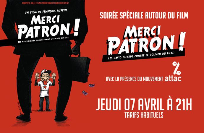 Cette semaine au cinéma le Travelling une soirée spéciale avec la projection du documentaire « Merci patron – les David Picards contre le Goliath du Luxe » ce jeudi 7 avril à 21h00 projections suivi d’un débat avec le mouvement Attac… toutes les infos sur http://cineagde.com/