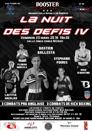 Vendredi 25 mars la salle Zinga Zanga « La nuit des défis 4 » avec 3 combats pro anglaise et 3 combats de Kick Boxing et 5 combats amateurs. Location des places dans vos points de ventes Habituels, vous pourrez assister à la pesée et au face à face des boxeurs ce soir à 18h00 galerie marchande Auchan Béziers