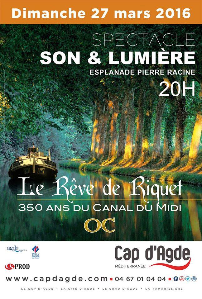 Ce dimanche 27 mars weekend l’anniversaire du Canal du Midi qui fête cette année ses 350 ans. Il retrace la formidable épopée de cet ouvrage unique au monde et le fabuleux destin de son créateur, Pierre-Paul Riquet. A cette occasion deux rendez-vous : De 15h à 19h : présentation de l'activité touristique autour du Canal du Midi et à 20h00 le spectacle "Le Rêve de Riquet" son et lumière théâtralisé du groupe OC : rendez-vous Esplanade Pierre Racine sur le port du cap d’Agde.