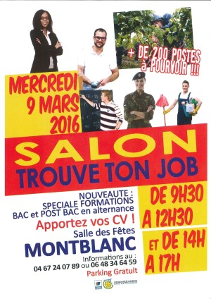Mercredi 9 mars rendez-vous avec le salon « Trouve ton Job »rendez-vous à la salle des fêtes de Montblanc des 9h30 avec + de 200 postes à pourvoir et un stand spécial formation BAC et POST BAC en alternance ,toutes les infos sur 04.67.24.07.89