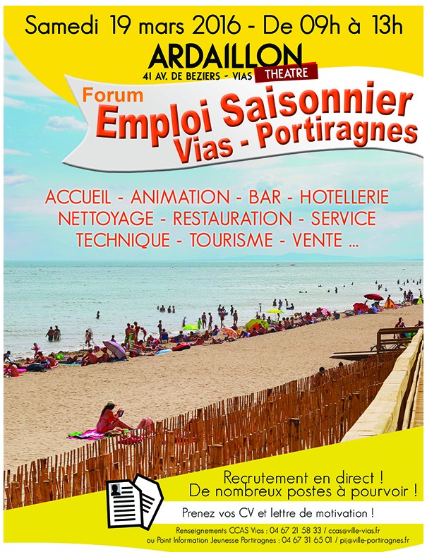 Samedi 19 mars le Centre Communal d’Action Sociale de Vias en partenariat avec la Ville de Portiragnes organise le 1° Forum de l’Emploi Saisonnier à Vias au Théâtre de L’Ardaillon de 9h à 13h. Plusieurs dizaines d’employeurs de Vias et des communes voisines, représentant différents secteurs d’activités proposeront de nombreux postes pour la saison estivale, plus d’info au Tél. 04 67 21 79 76