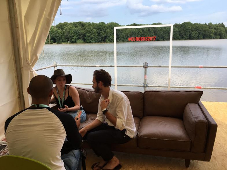 Assis sur un canapé, à l’écart de la foule qui se presse de plus en plus sur la presqu’île du Malsaucy, Tom Smith évoque ses premières Eurockéennes, il y a 10 ans de cela. En 2007, il se souvient de sa venue avec le groupe « C’était quelque chose d’assez particulier, parce que nous fêtions plusieurs choses … Notre venue dans un des plus gros festivals de France pour commencer, et le fait qu’on avait appris la veille que notre album était numéro 1 des ventes en Angleterre ! » Ambiance festive donc à la décennie dernière ! « Nous avions fêté cette annonce à coup de champagne*, et le lendemain, nous nous réveillions avec le lac, les montagnes au loin, et un super concert en perspective » poursuit-il.