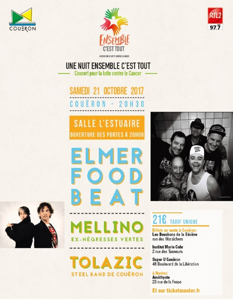RTL2 Nantes présente la nuit ensemble c’est tout, le samedi 21 octobre salle L'Estuaire à Couëron. Dès 20h30 venez applaudir Elmer Food Beat, Mélino ex Negresse Verte et Tolazic le steel band de Couéron.