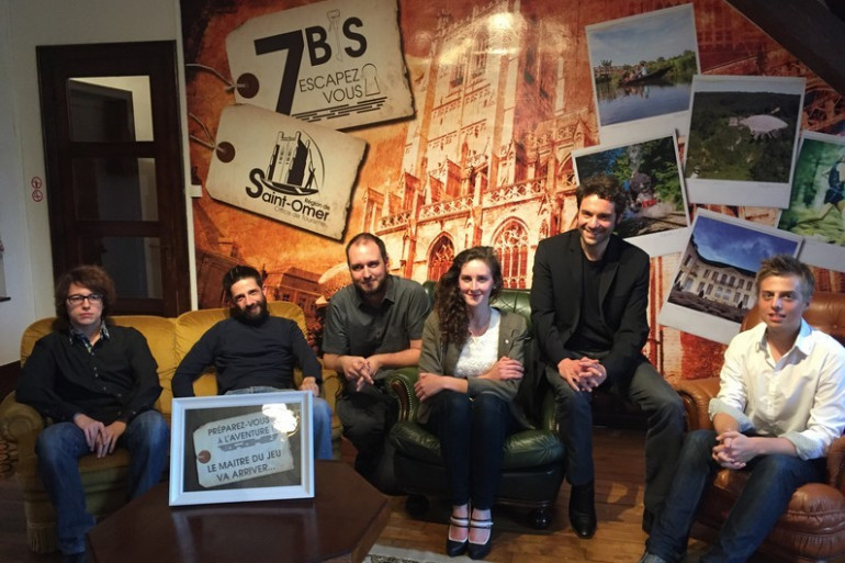 Julien Duquesne, président de l'Office de tourisme de Saint-Omer, entouré des maîtres du jeu, Antoine, Arnaud, Julien, Marine et Joffrey