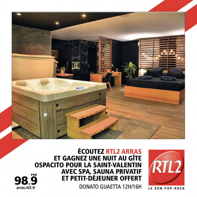 Jouez avec Donato Guaetta entre midi et 16h, dès que vous entendez le signal RTL2, appelez le 03 59 85 32 01 et gagnez une nuit au gîte Ospacito pour la Saint-Valentin, avec SPA, sauna privatif et petit-déjeuner offert.