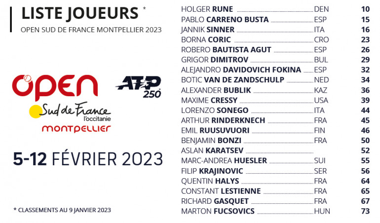 L'Open Sud de France - Montpellier est un tournoi ATP 250 faisant partie de l'ATP Tour. La 13ème édition se déroulera du 5 au 12 février 2023 à la Sud de France Arena.