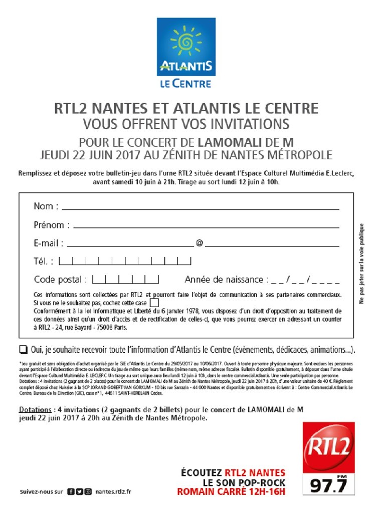 Jusqu'au 10 juin, jouez à Atlantis le Centre et gagnez vos invitations pour découvrir Lamomali de M le 22 juin au Zénith de Nantes. Pour jouer, remplissez le bulletin de jeu que vous trouverez dans les 150 boutiques de la galerie ou ci-dessous et déposez le dans l'urne géante RTL2 près de l'espace culturel. (Tirage au sort lundi 12 juin)