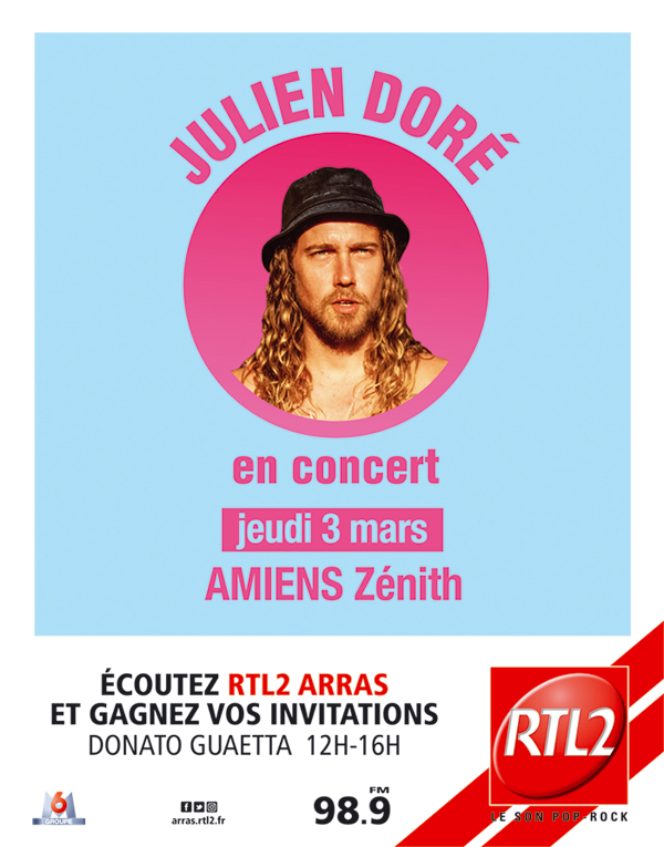 Jouez avec Donato Guaetta entre midi et 16h, dès que vous entendez le signal RTL2, appelez le 03 59 85 32 01 et gagnez vos invitations pour le concert de Julien Doré le 03 mars à Amiens.