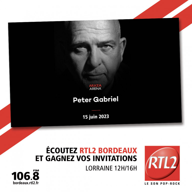 Jouez avec Lorraine entre midi et 16h, dès que vous entendez le signal RTL2, appelez le 05 40 25 33 11 et gagnez vos invitations pour le concert RTL2 de Peter Gabriel le 15 juin à l'Arkéa Arena de Floirac.