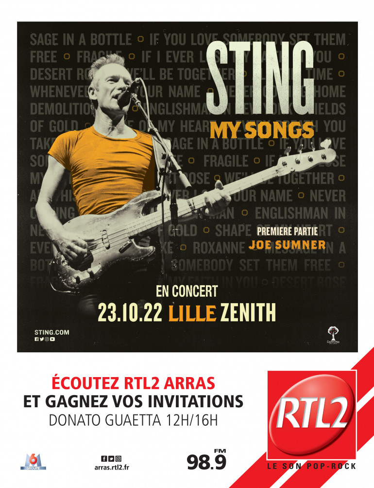 Jouez avec Donato Guaetta entre midi et 16h, dès que vous entendez le signal RTL2, appelez le 03 59 85 32 01 et gagnez vos invitations pour le dernier concert de la tournée "My songs" de Sting le dimanche 23 octobre au Zénith de Lille.