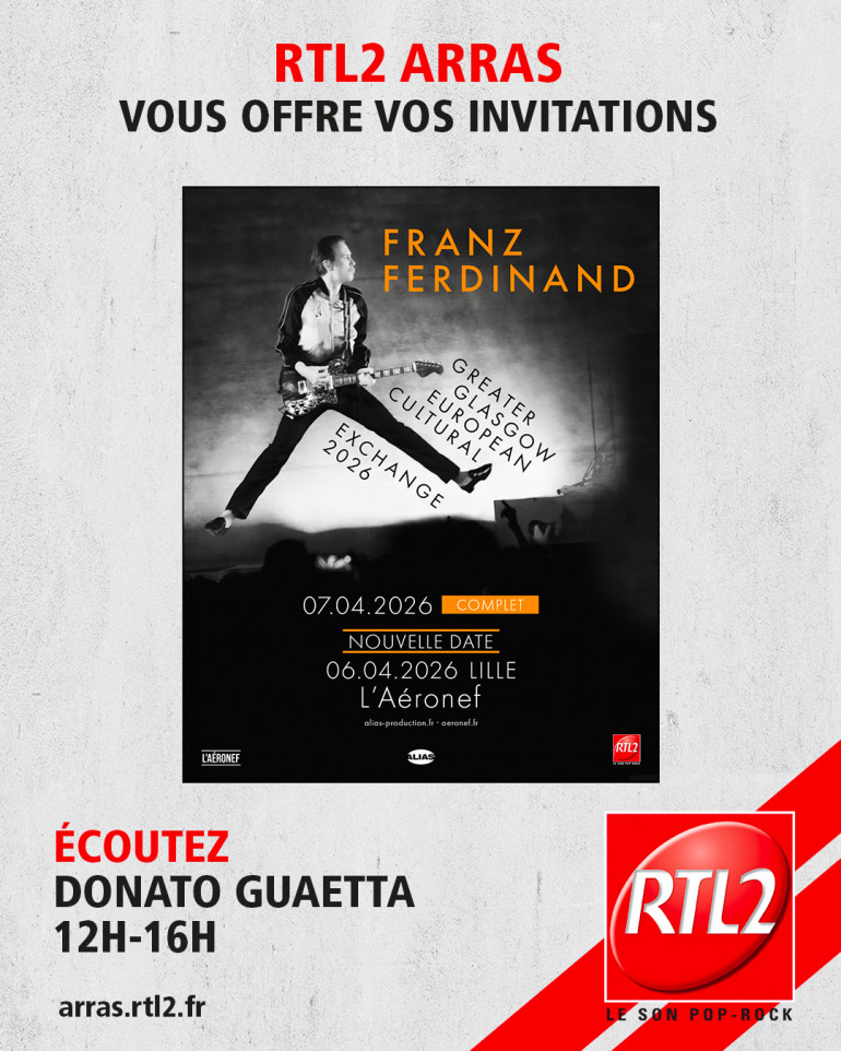 Jouez avec Donato Guaetta entre midi et 16h, dès que vous entendez le signal RTL2, appelez le 03 59 85 32 01 et gagnez vos invitations pour les concerts de Franz Ferdinand les 06 et 07 avril 2026 à l'Aéronef de Lille avec RTL2.