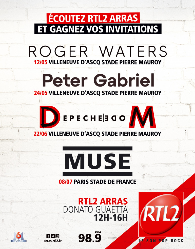 Jouez avec Donato Guaetta entre midi et 16h, dès que vous entendez le signal RTL2, appelez le 03 59 85 32 01 et gagnez vos invitations pour les concerts de Roger Waters, Peter Gabriel, Depeche Mode et Muse.