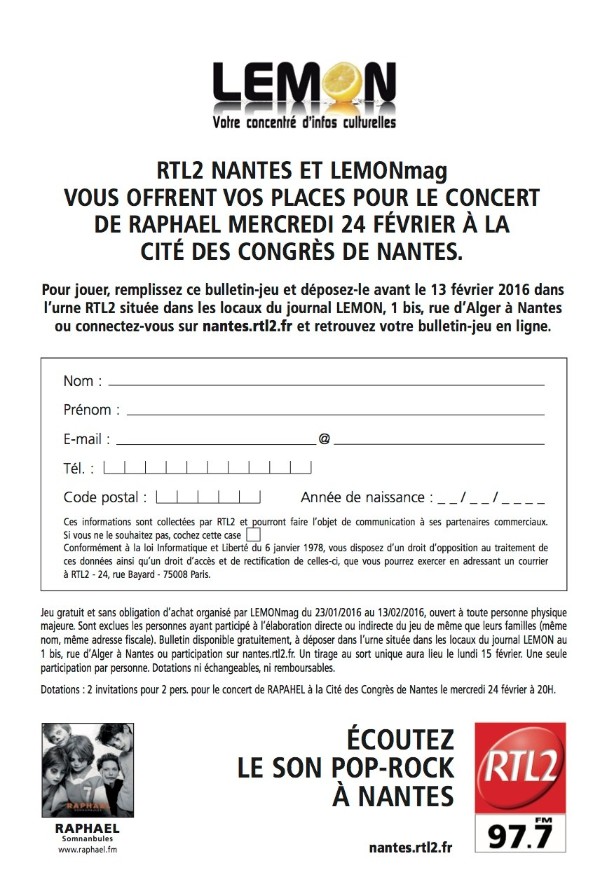 Téléchargez, imprimez et remplissez le bulletin de jeu ci-dessous, ensuite il suffit de le déposer dans l'urne RTL2 située dans les locaux du journal gratuit LEMON (1 bis, rue d'Alger à Nantes) avant le 13 février 2016.