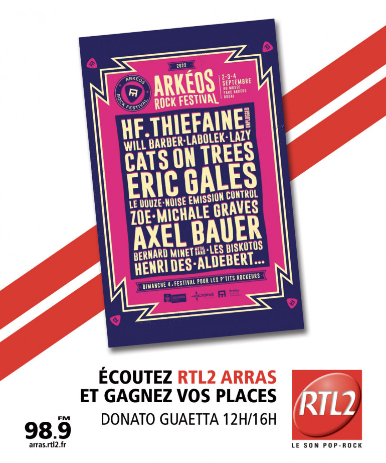 Jouez avec Donato Guaetta entre midi et 16h, dès que vous entendez le signal RTL2, appelez le 03 59 85 32 01 et gagnez vos pass 3 jours pour l'Arkéos Rock Festival les 2, 3 et 4 septembre 2022 au Musée Park Arkéos avec Axel Bauer, Cats on Trees et beaucoup d'autres artistes.