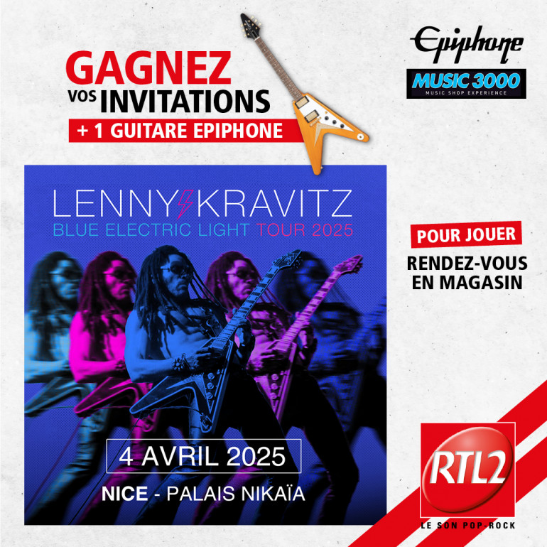 RTL2 Côte d'Azur et les magasins Music3000 de Cannes, Saint-Laurent-du-Var et Nice-Centre vous invite au concert de Lenny Kravitz le 04 Avril au Palais Nikaia de Nice et vous offre la possibilité de gagner votre guitare Epiphone Flying V Korina !