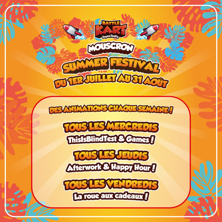 Du 1er juillet au 31 août, l’été s’annonce chaud et complètement délirant avec un programme d’animations chaque semaine, des événements festifs et notre concept unique mêlant kart électrique & réalité augmentée. Découvre notre programme sur nos réseaux sociaux !